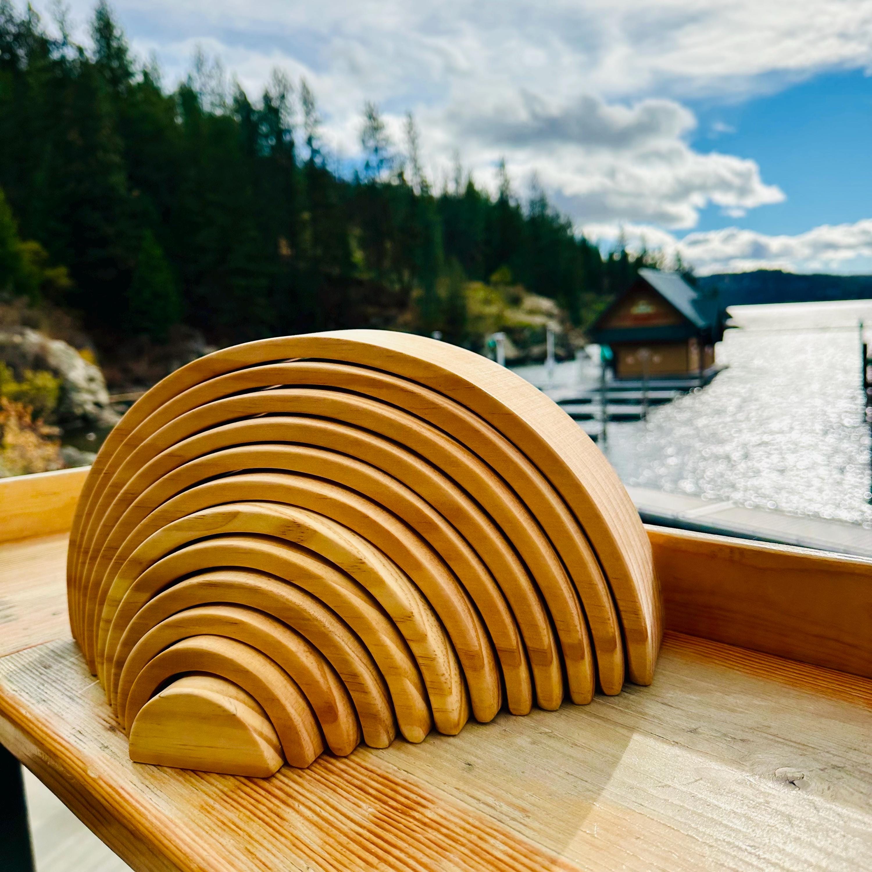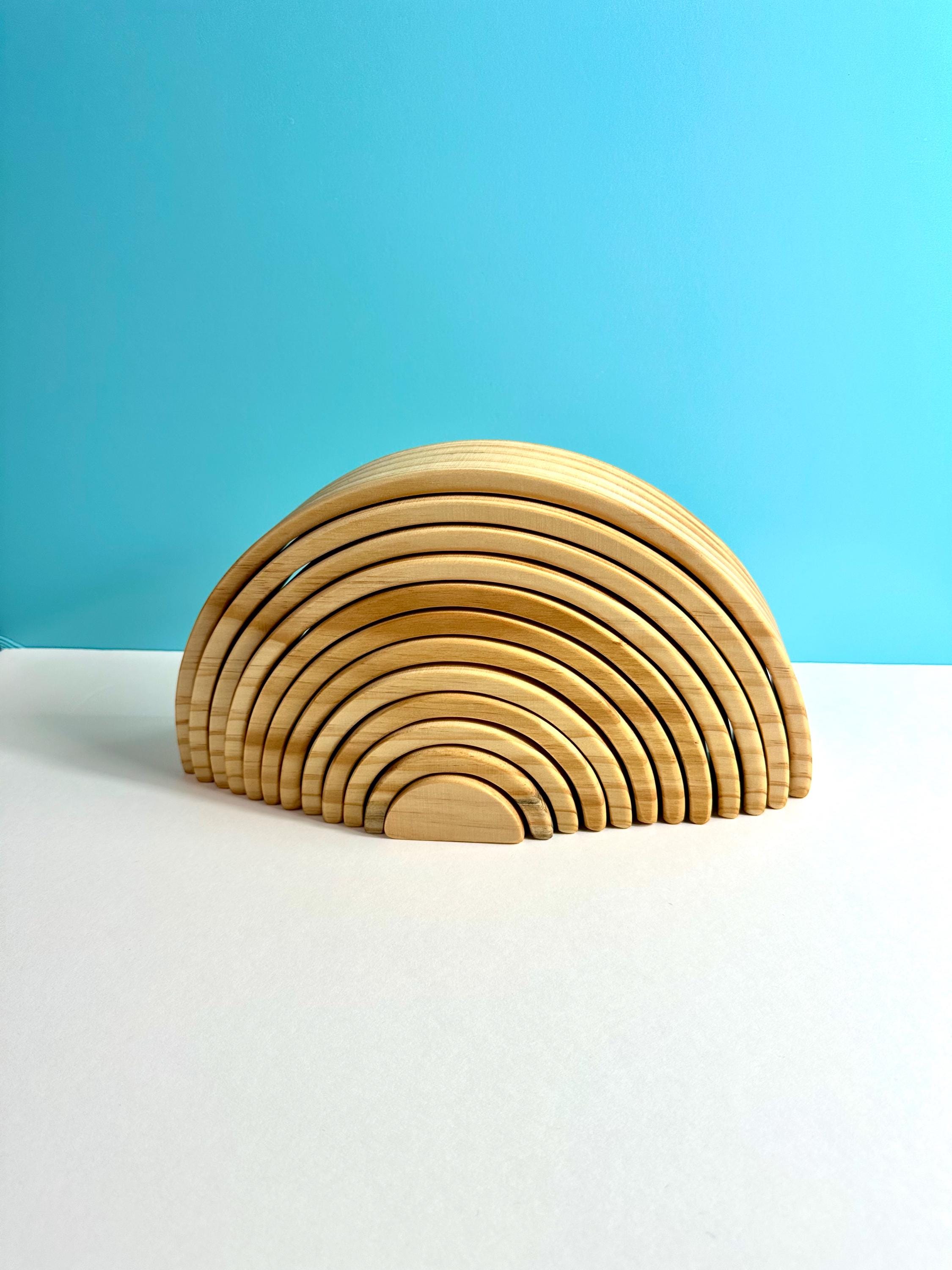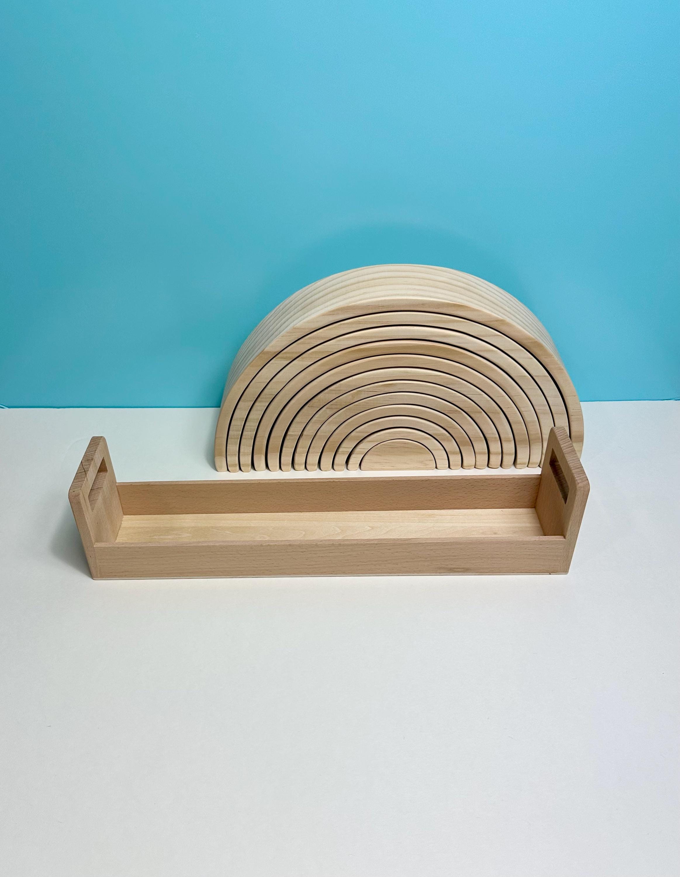 This handcrafted wooden rainbow stacking toy offers endless opportunities for creative play and developmental growth. Made from high-quality, sustainable birch wood, this rainbow features velvety smooth, natural wood grain and is available unfinished or with a nontoxic finish of linseed oil and beeswax. Measuring 14.5" x 7" x 2.75", it’s perfect for children to explore, be creative, and discover spatial relationships. Add a 1.5” wooden ball for even more fun and versatility, also you may opt for a sturdy wooden box to keep everything organized. Ideal for Waldorf and Montessori-inspired play, this timeless toy nurtures imagination, problem-solving skills, and fine motor development.