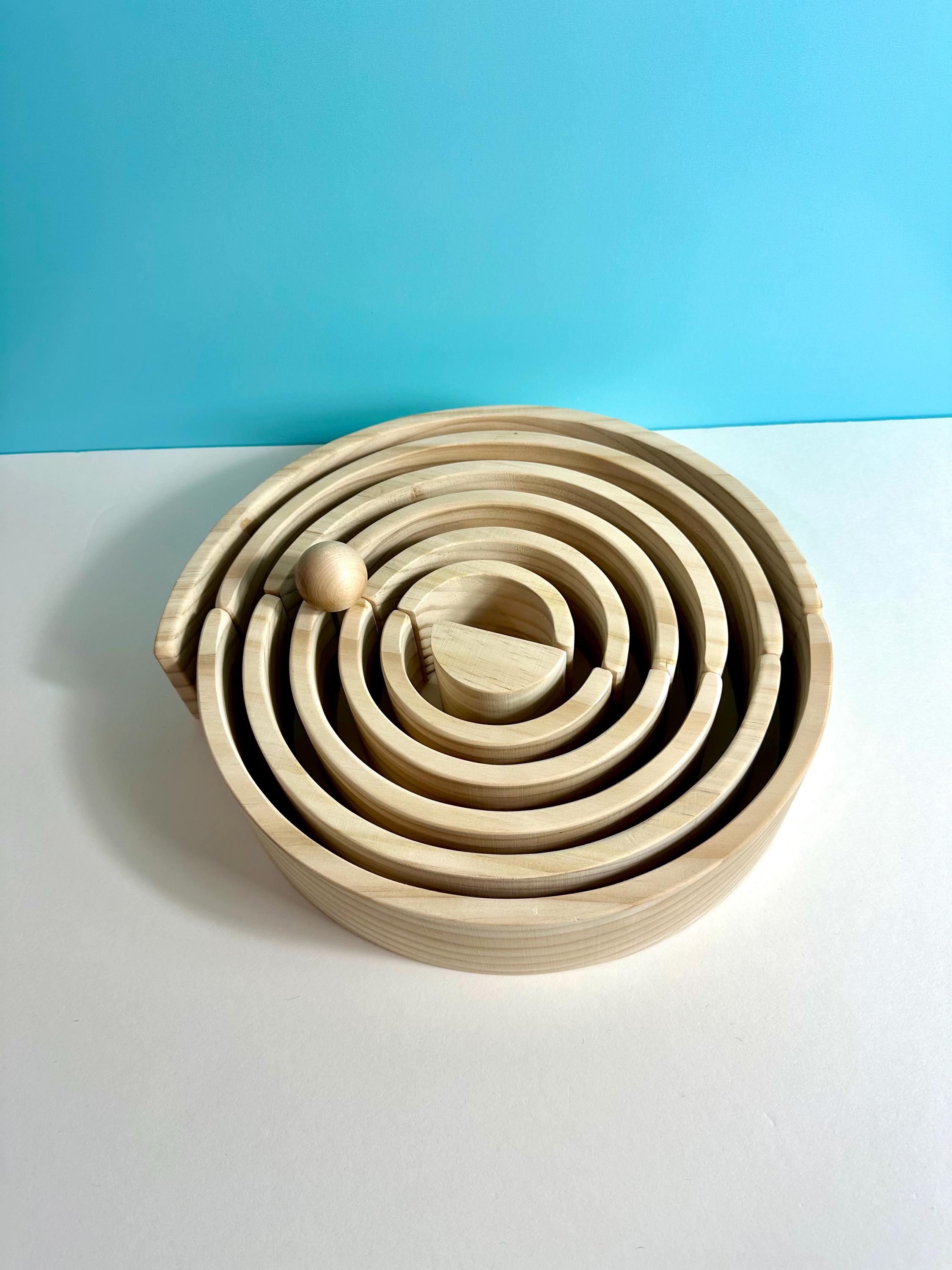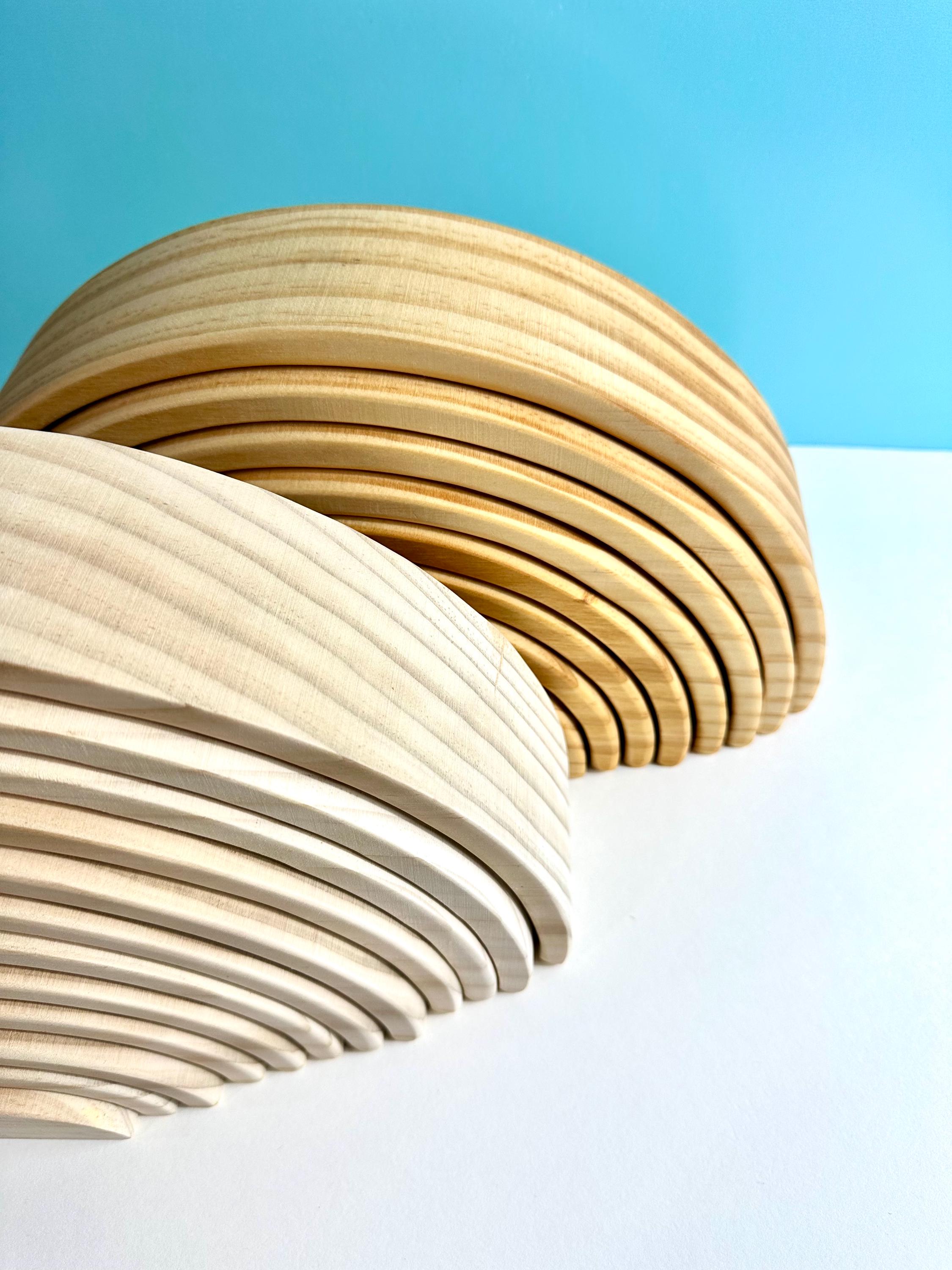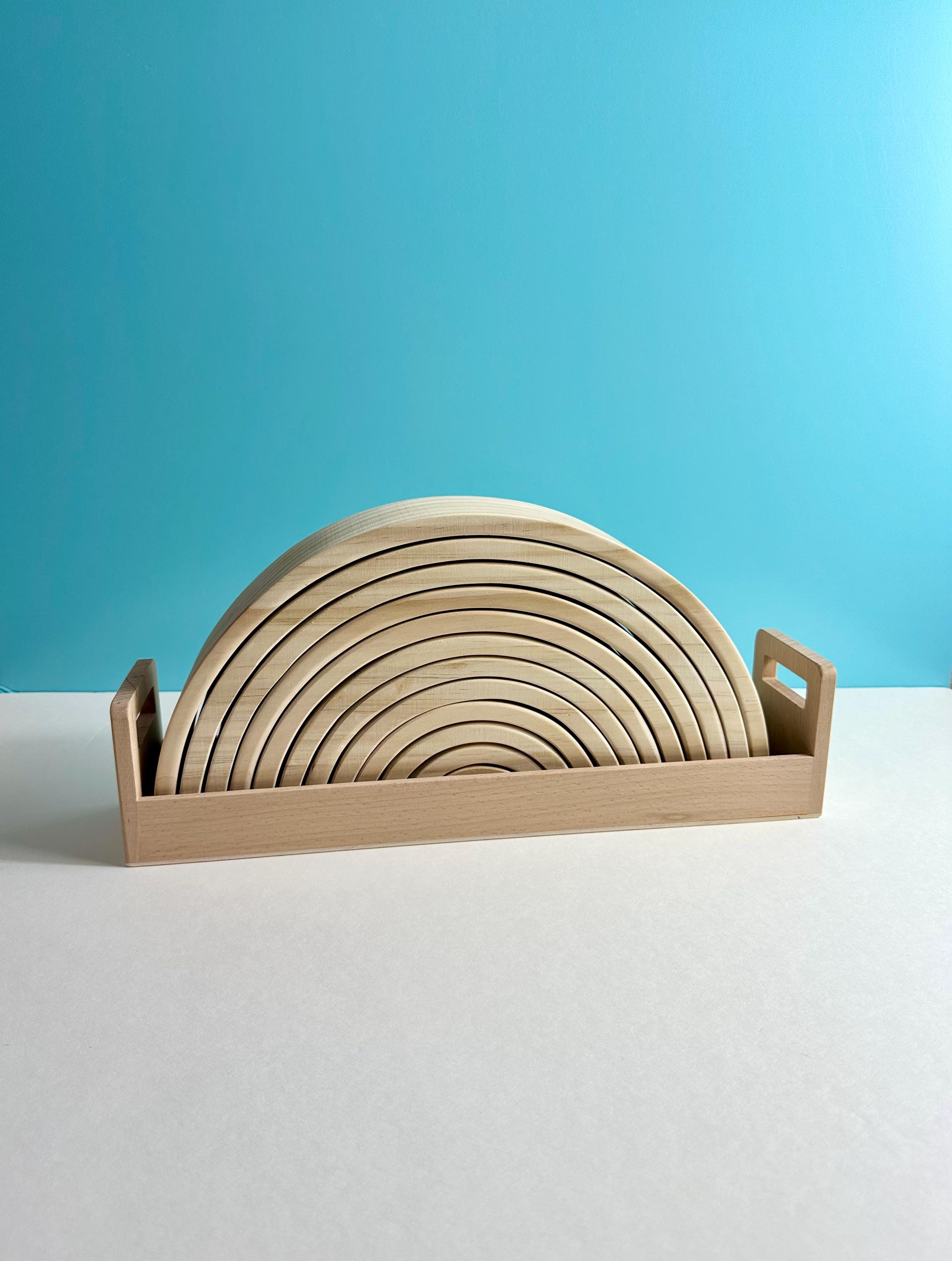 This handcrafted wooden rainbow stacking toy offers endless opportunities for creative play and developmental growth. Made from high-quality, sustainable birch wood, this rainbow features velvety smooth, natural wood grain and is available unfinished or with a nontoxic finish of linseed oil and beeswax. Measuring 14.5" x 7" x 2.75", it’s perfect for children to explore, be creative, and discover spatial relationships. Add a 1.5” wooden ball for even more fun and versatility, also you may opt for a sturdy wooden box to keep everything organized. Ideal for Waldorf and Montessori-inspired play, this timeless toy nurtures imagination, problem-solving skills, and fine motor development.