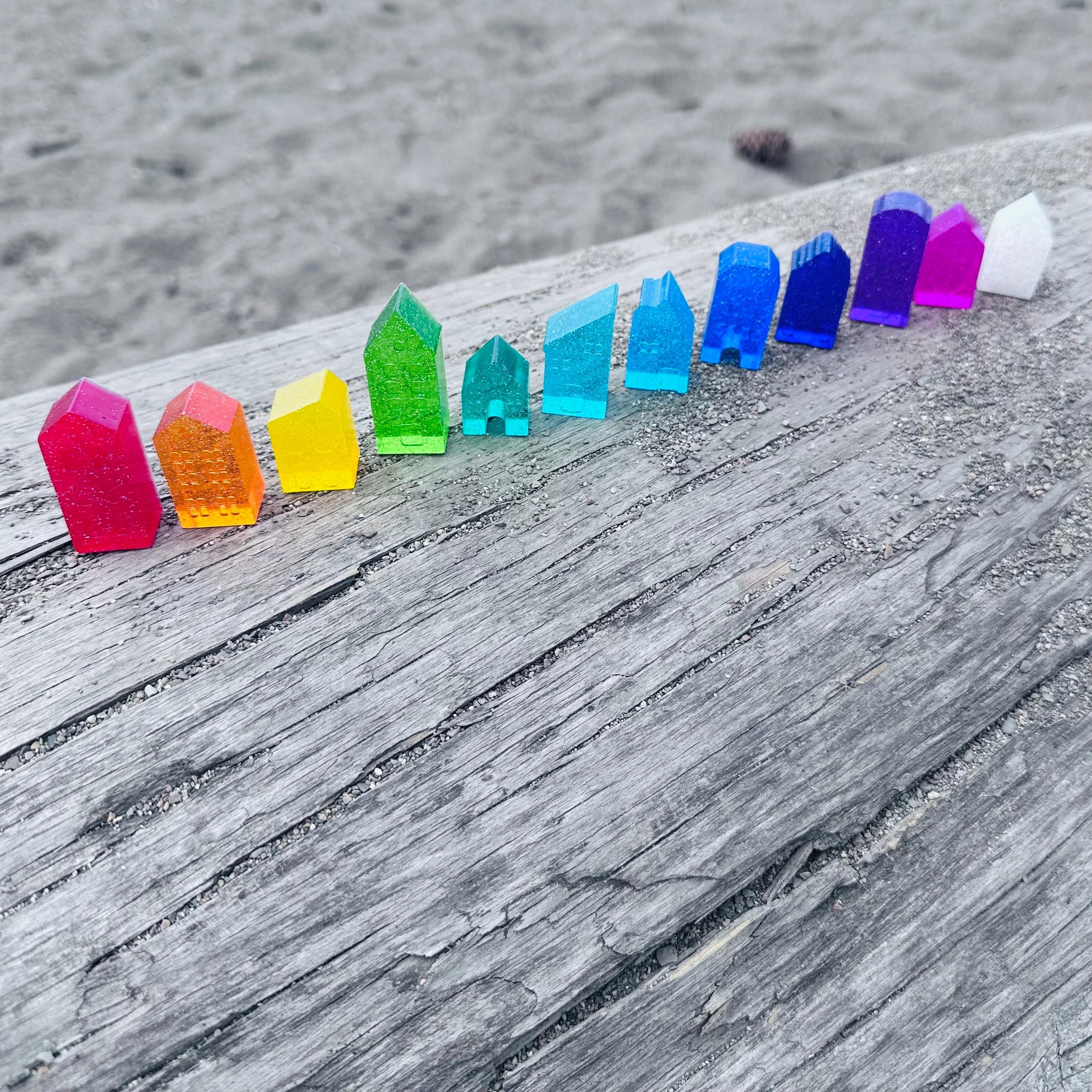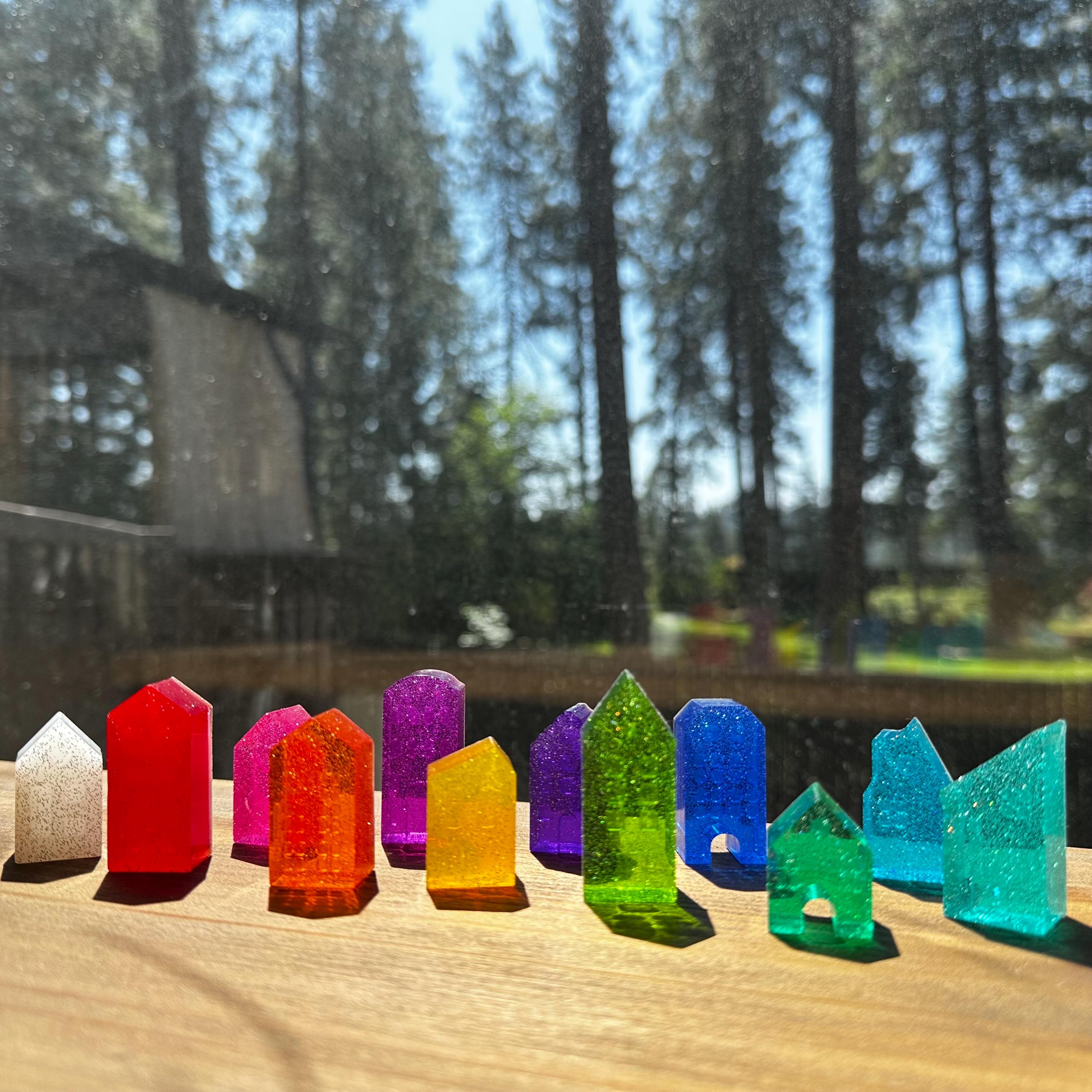 Each house measures between 1 and 1.75 inches tall and features a unique rainbow color infused with shimmering glitter, making them a delightful addition to Waldorf and Montessori-inspired activities.