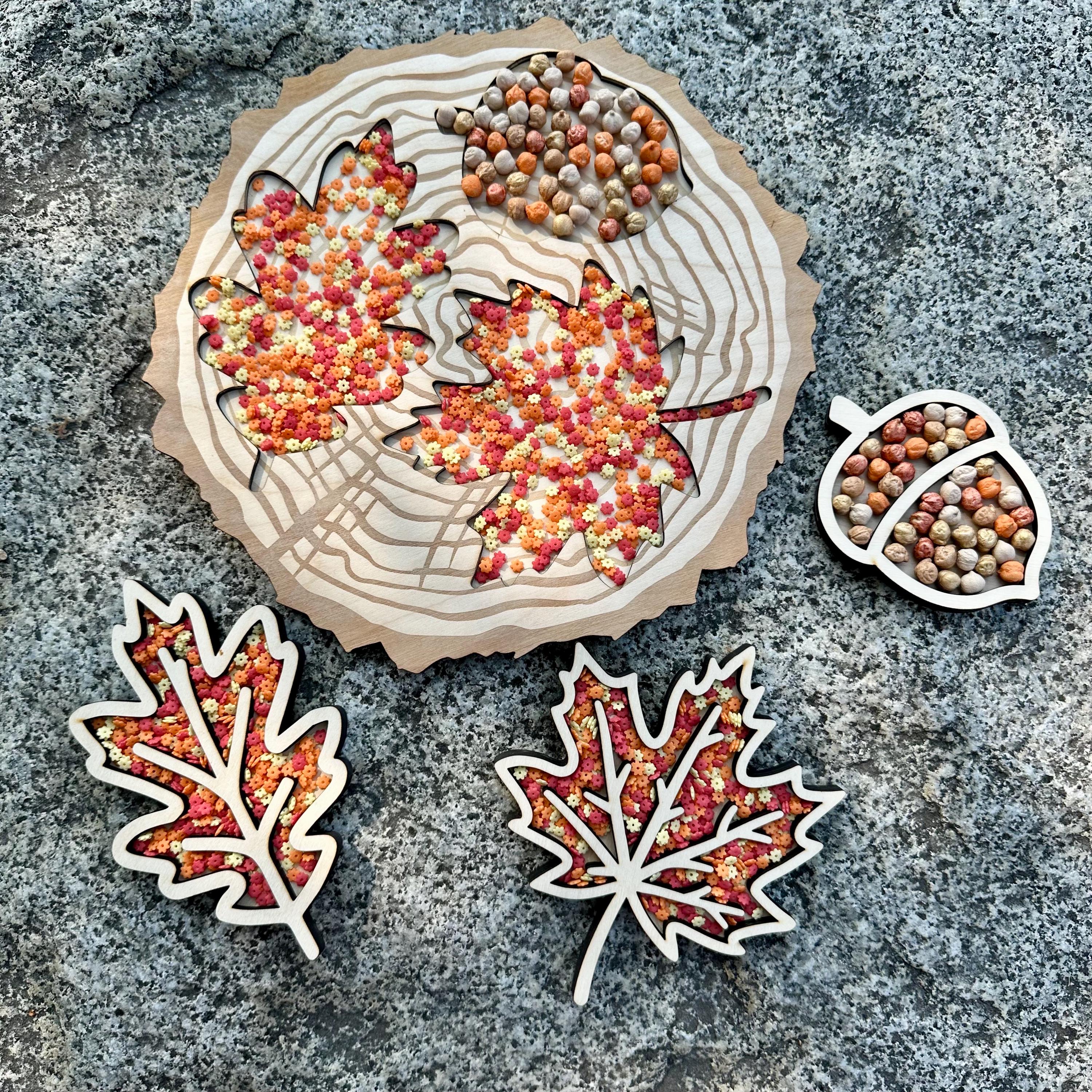 This unique wooden puzzle doubles as a set of mini tinker trays, perfect for sensory play! Designed with cozy fall vibes, the puzzle features a tree slice base with cutouts of a maple leaf, oak leaf, and acorn. Each piece can be used as a puzzle piece and as a little tinker tray for sensory fillers like rice, beans, pasta, lentils, or small treasures.