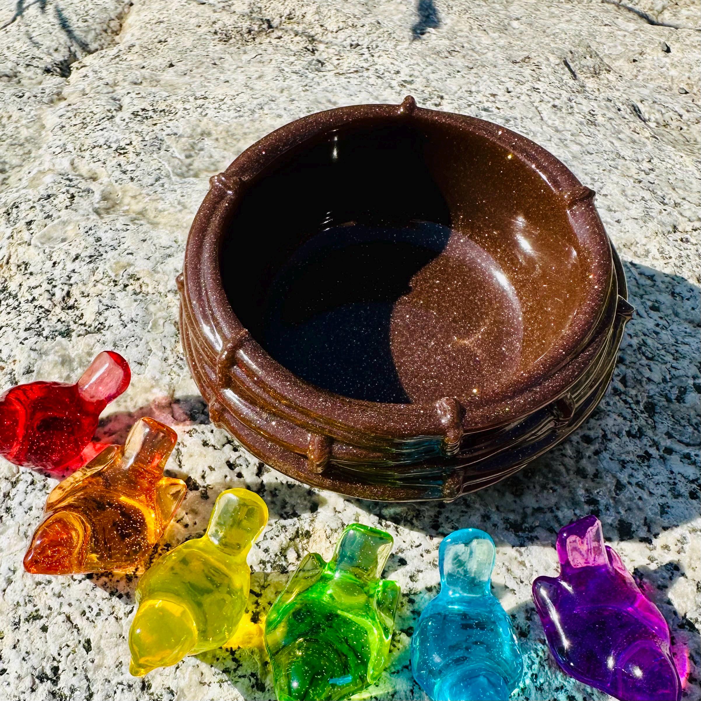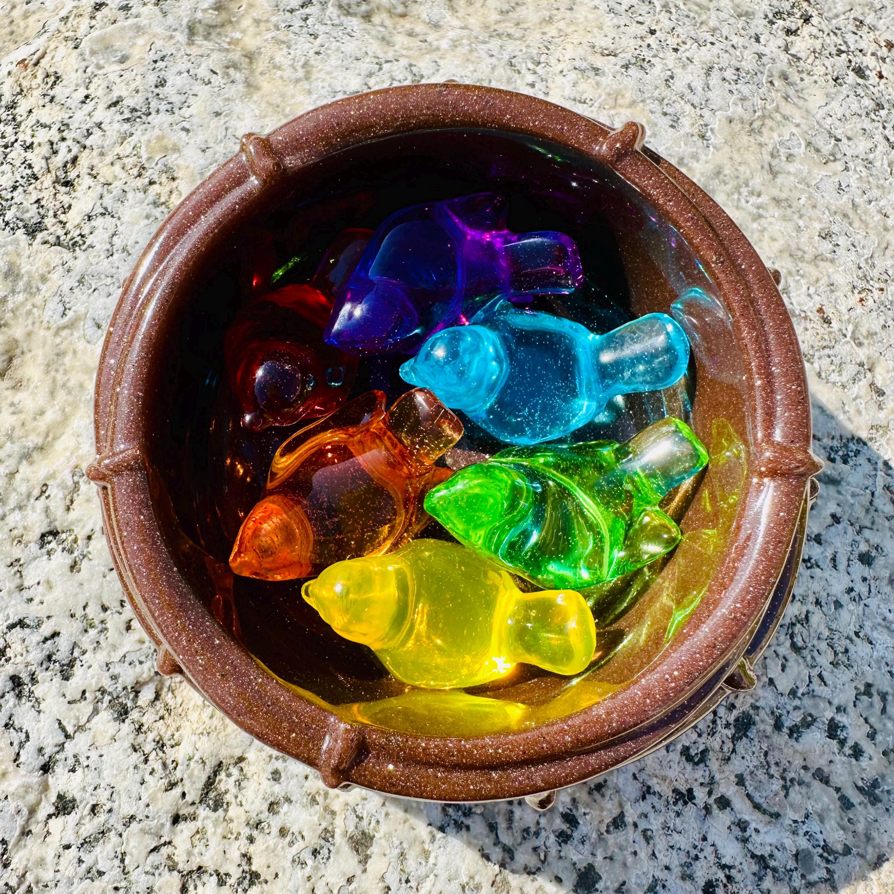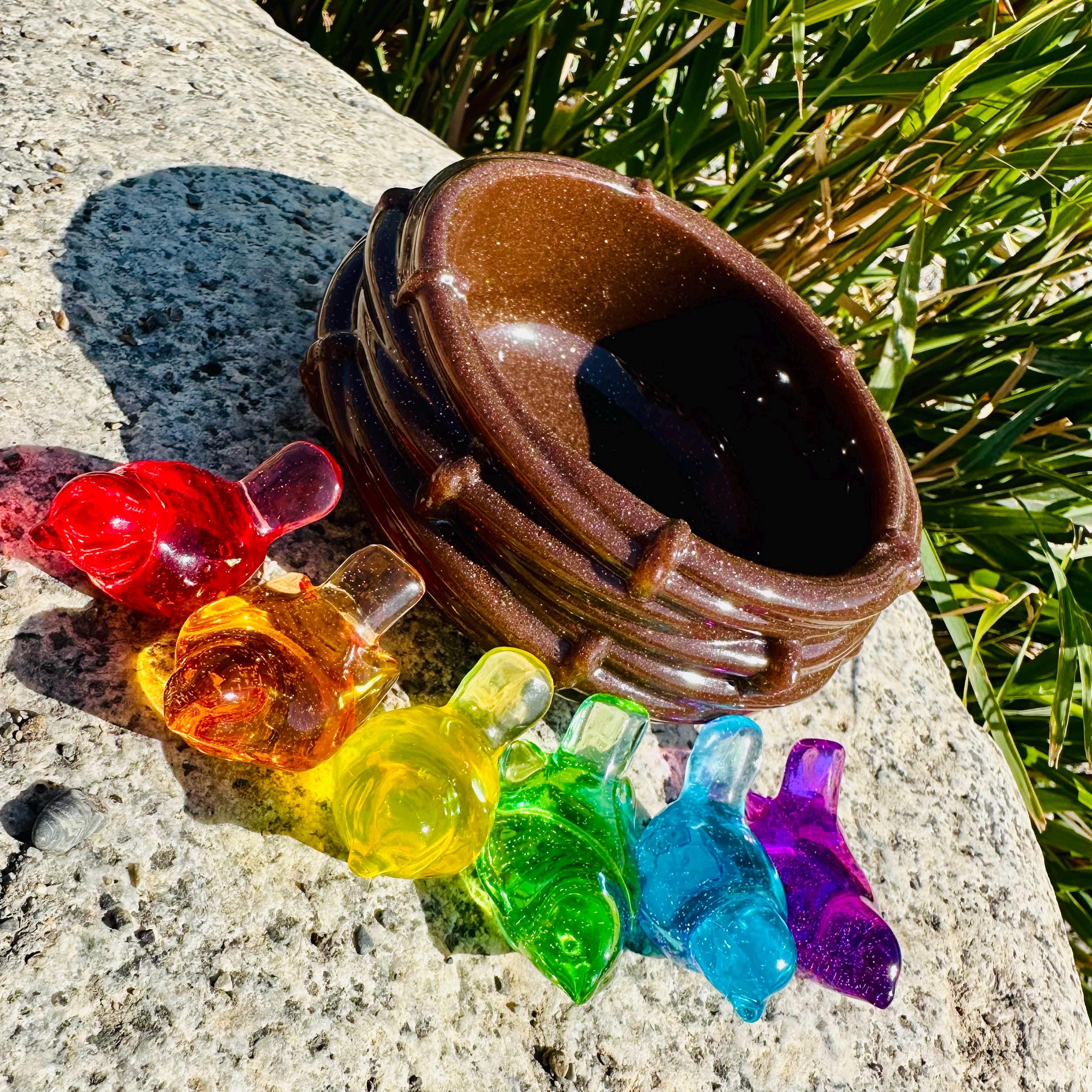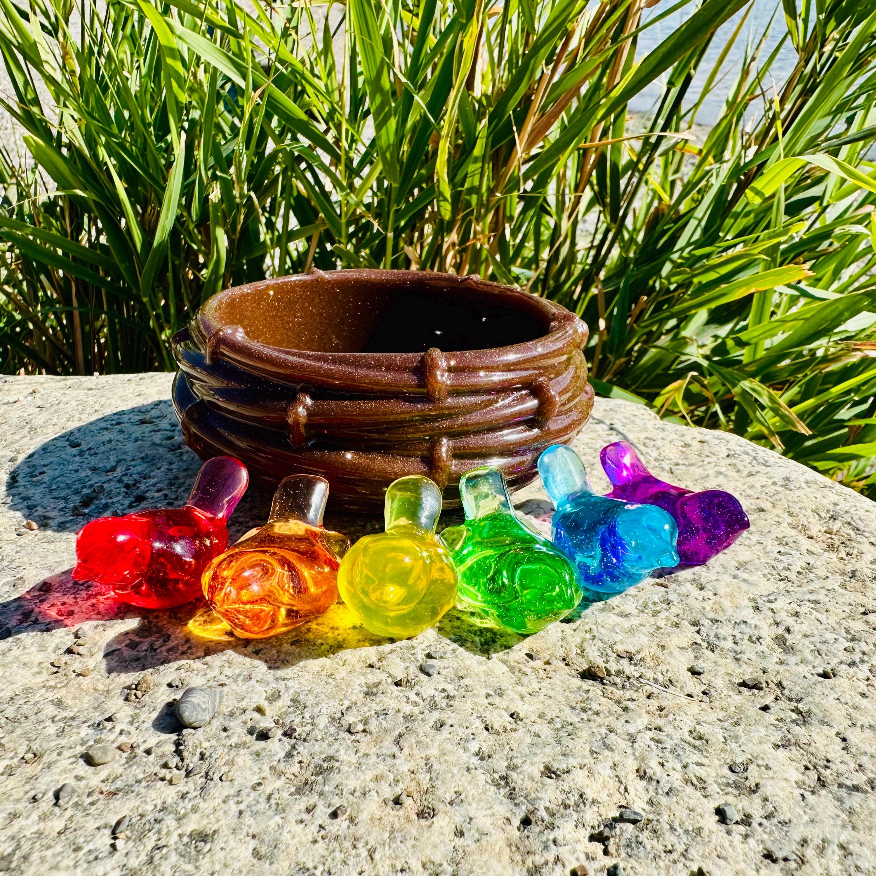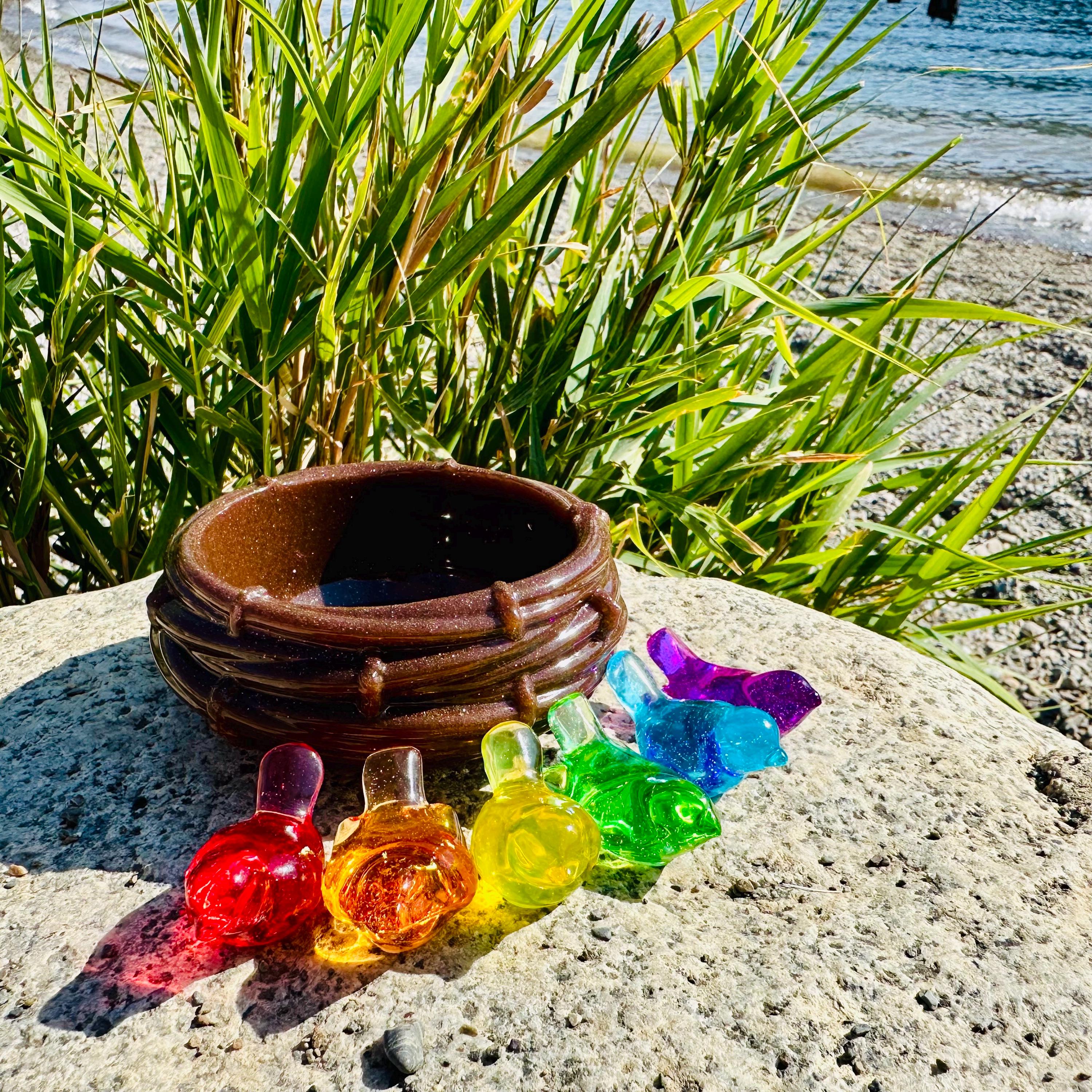 This set includes a beautifully textured resin “nest” bowl and six hand-poured resin birds in vibrant rainbow colors: red, orange, yellow, green, blue, and purple.