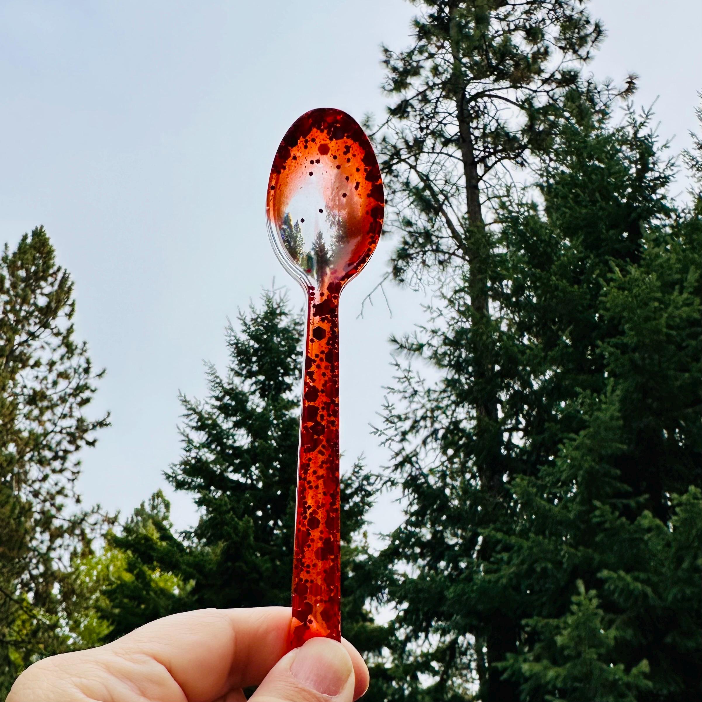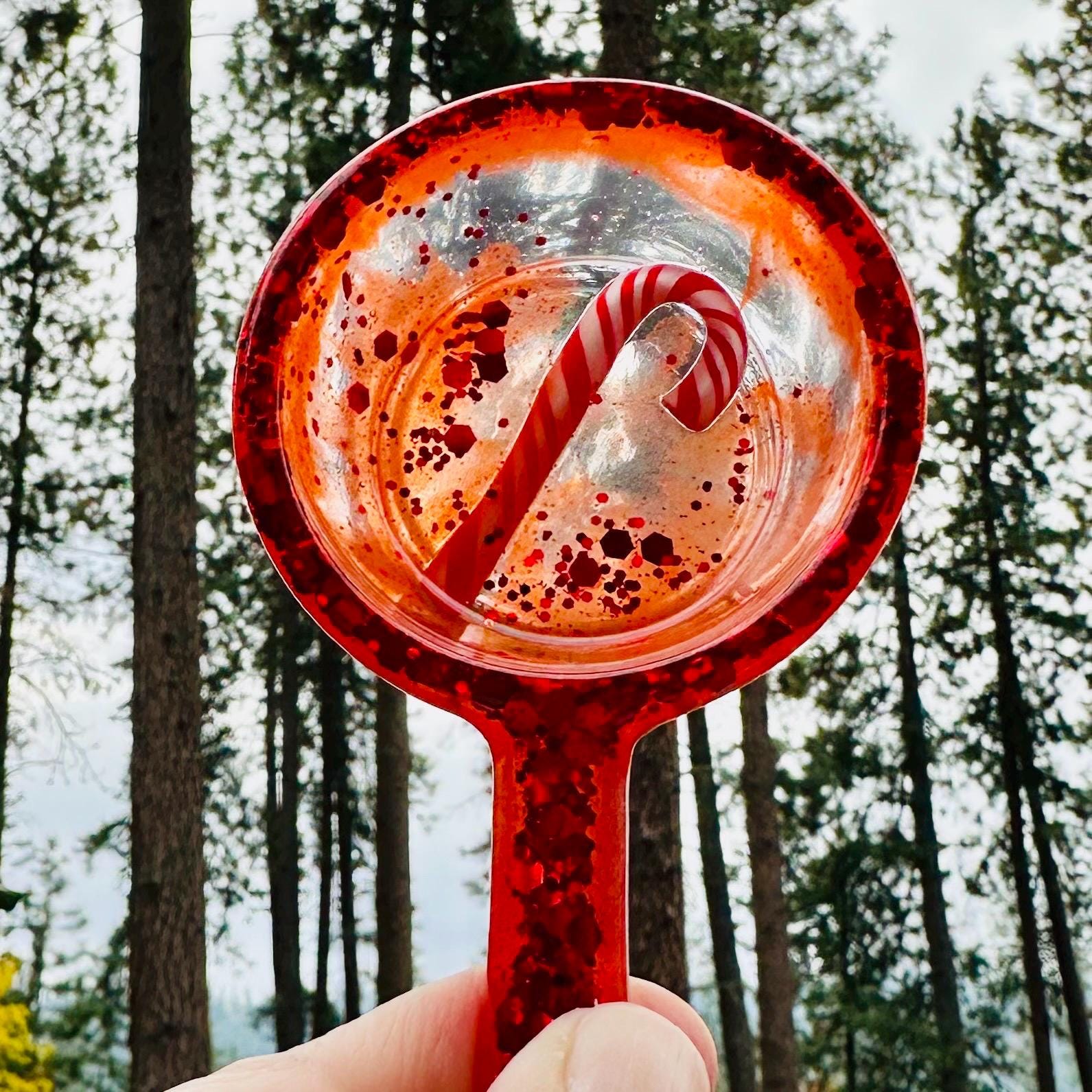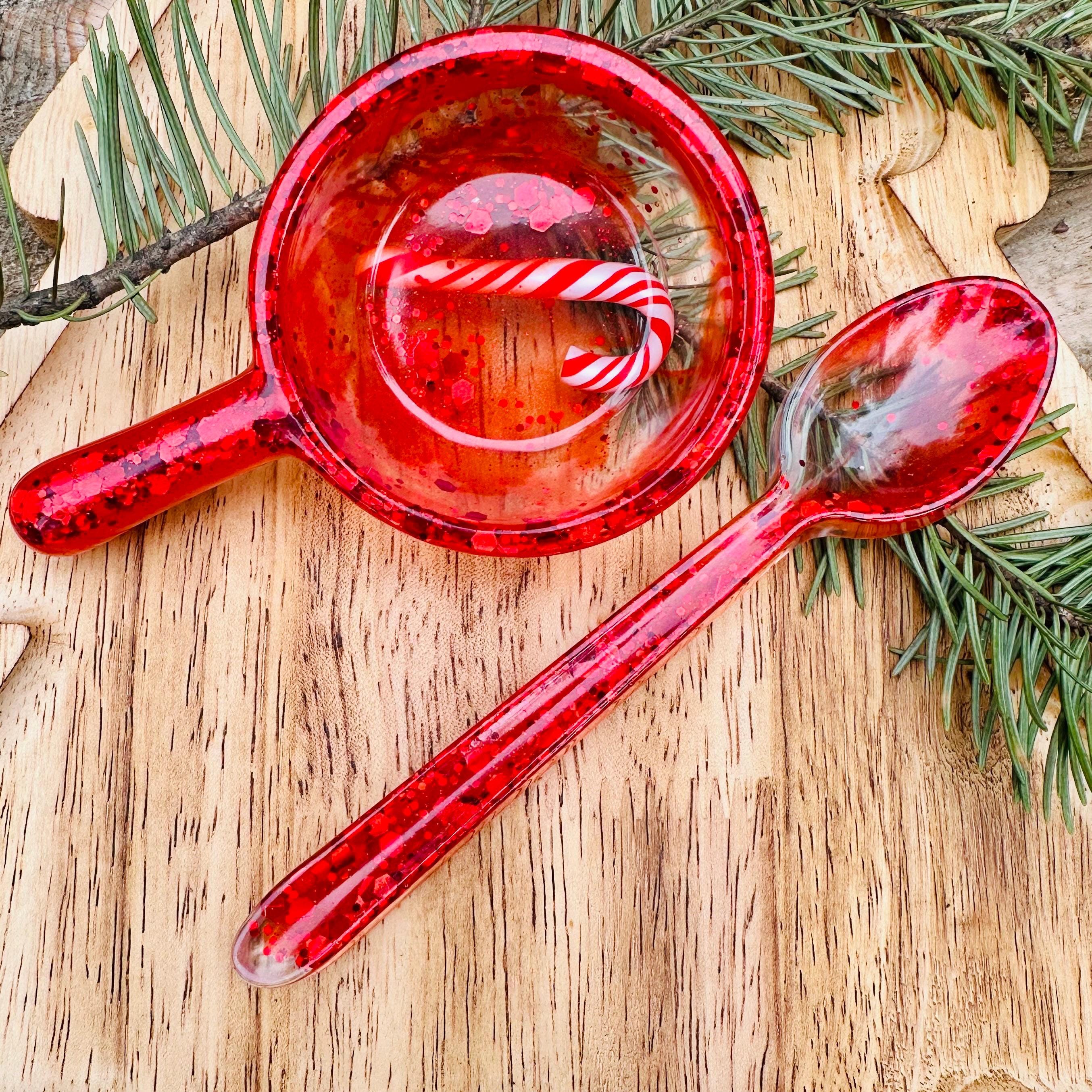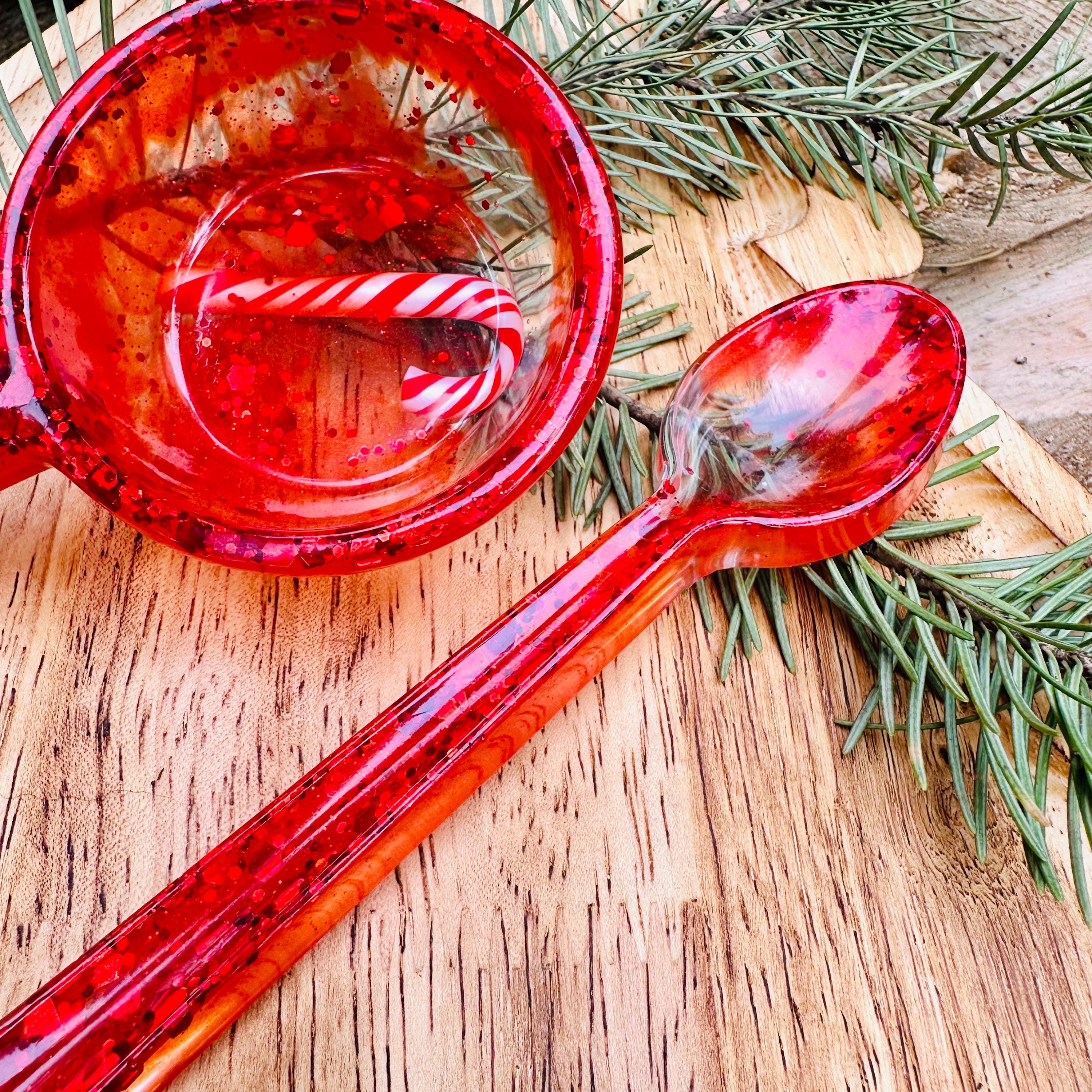 This festive Christmas resin tool set adds instant fun to any sensory bin or potion play setup! Each piece is filled with red sparkles and glitter, and the scoop features a candy cane! Just enough to spark the imagination.