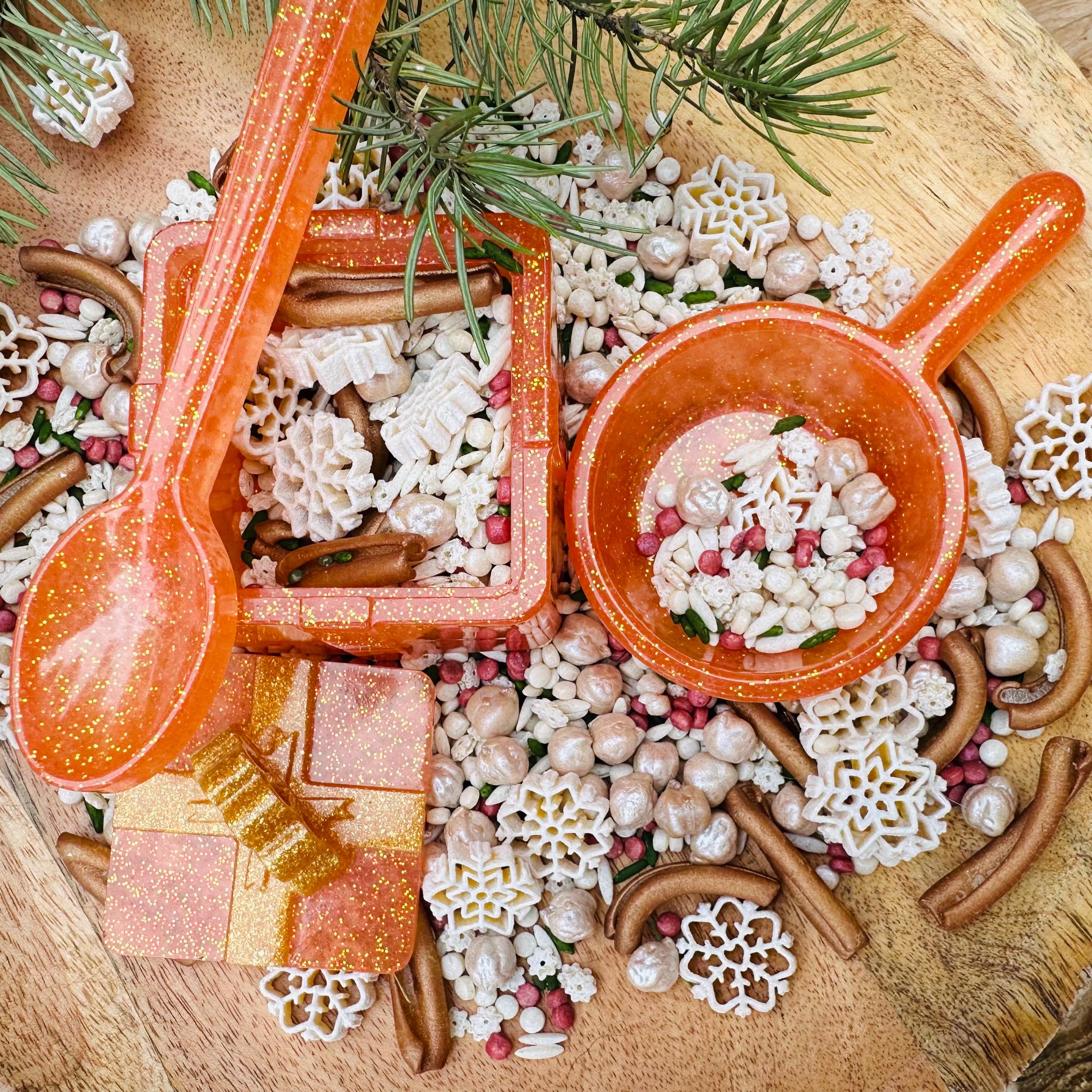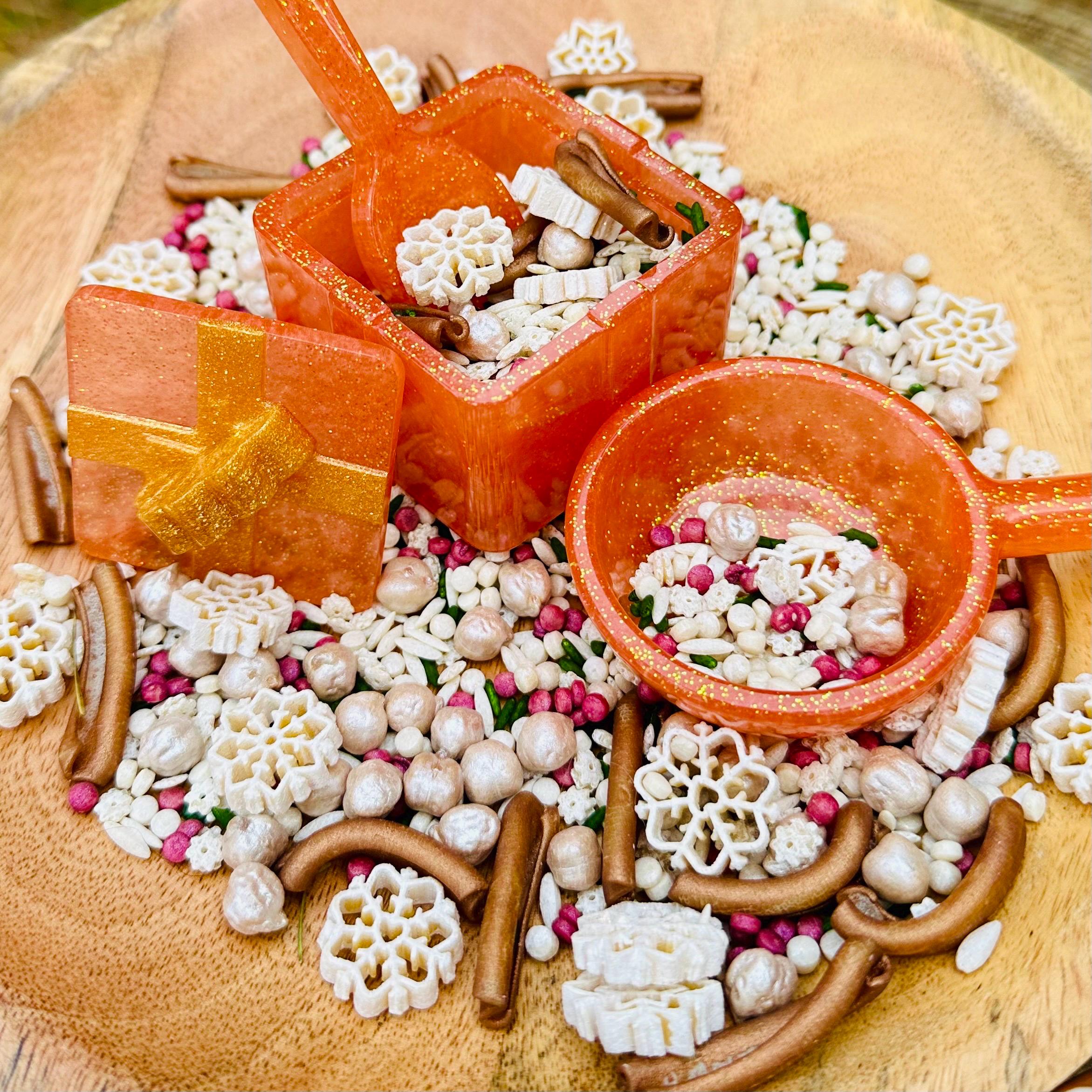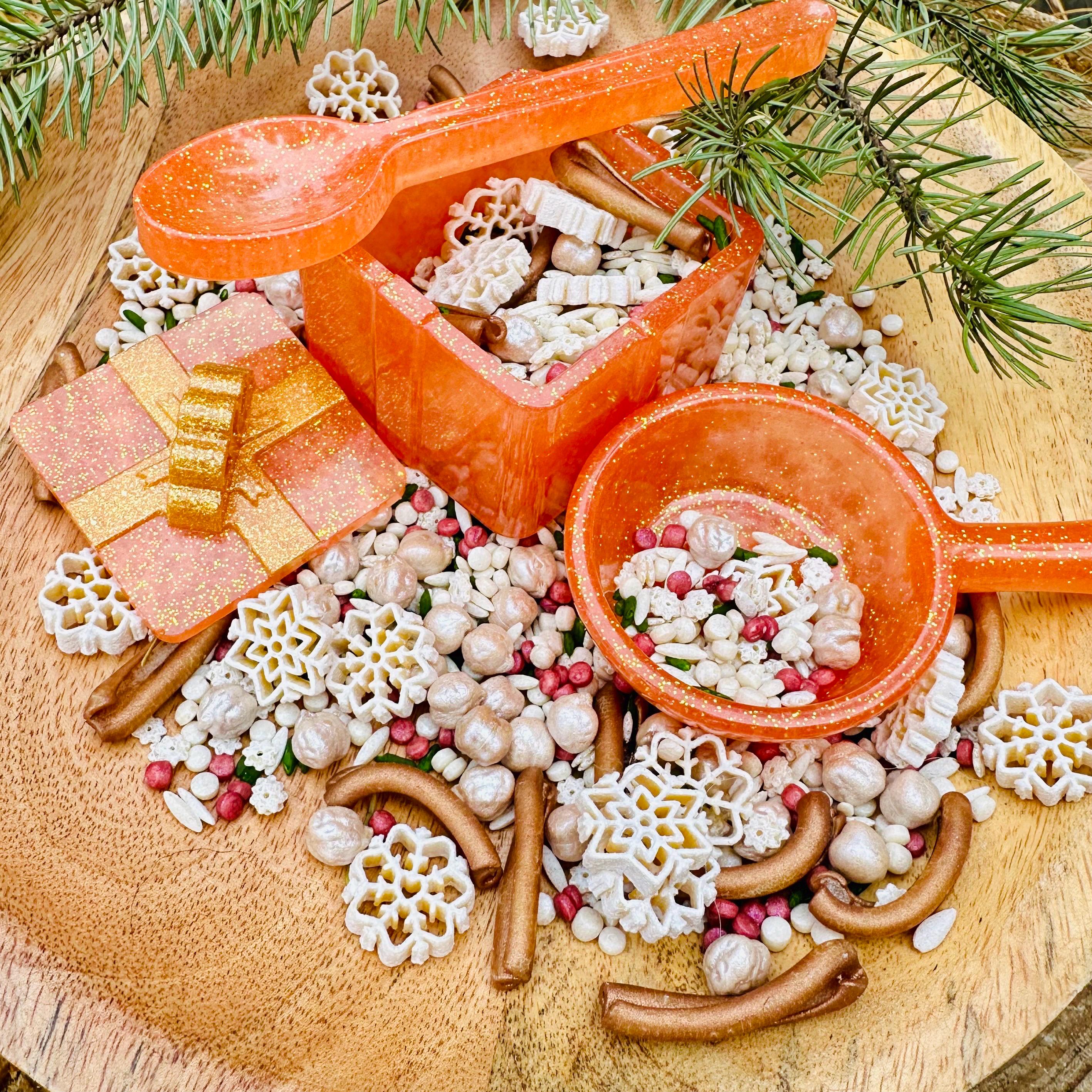 This glittering sensory play set features a festive resin gift box that really opens, along with a matching scoop and spoon for stirring, scooping, pouring, mixing, and hiding little treasures.