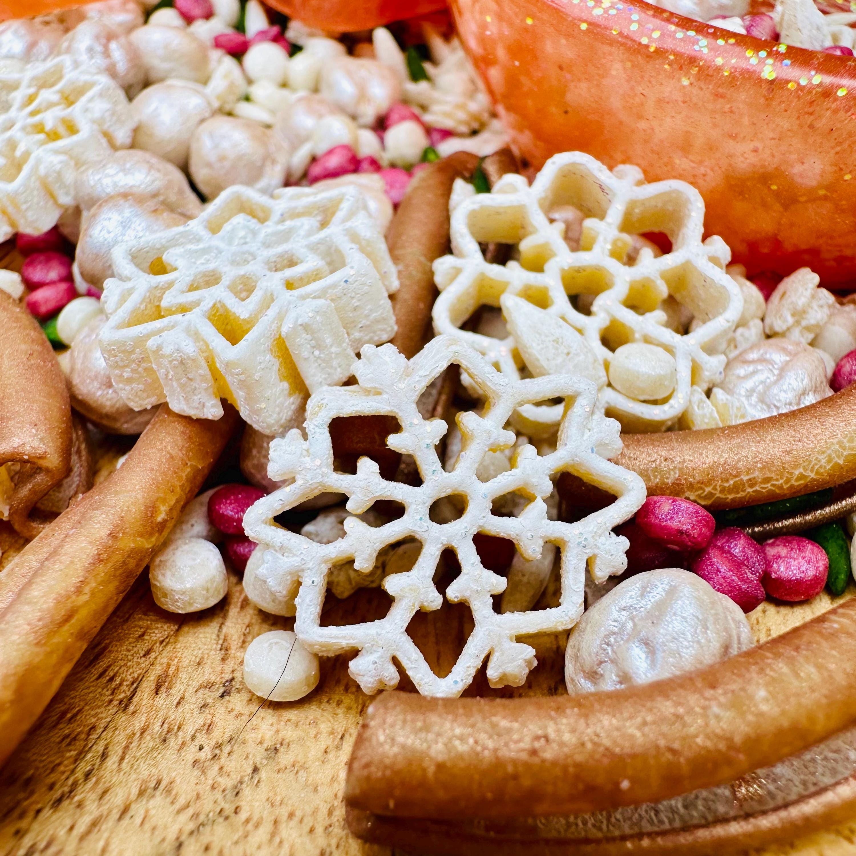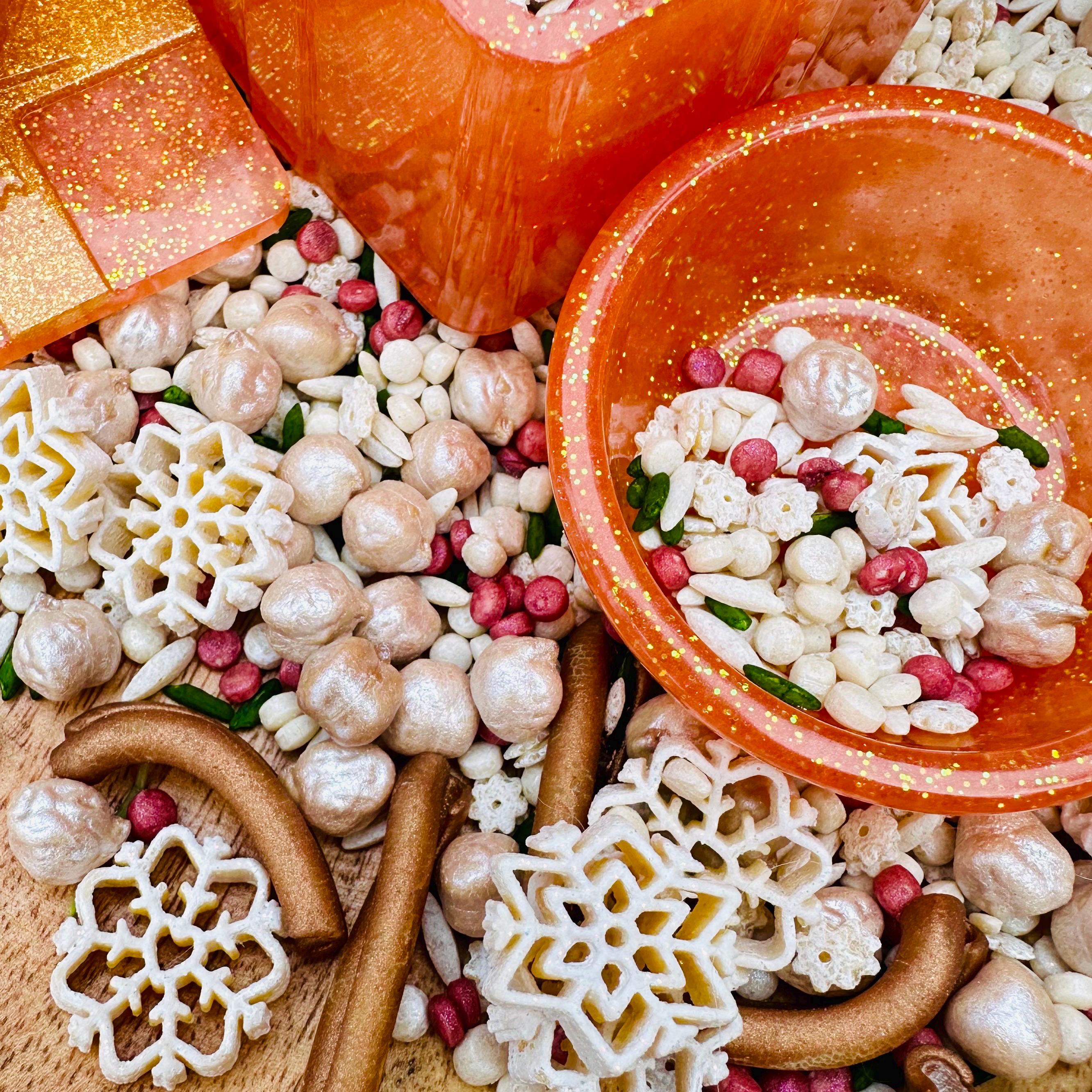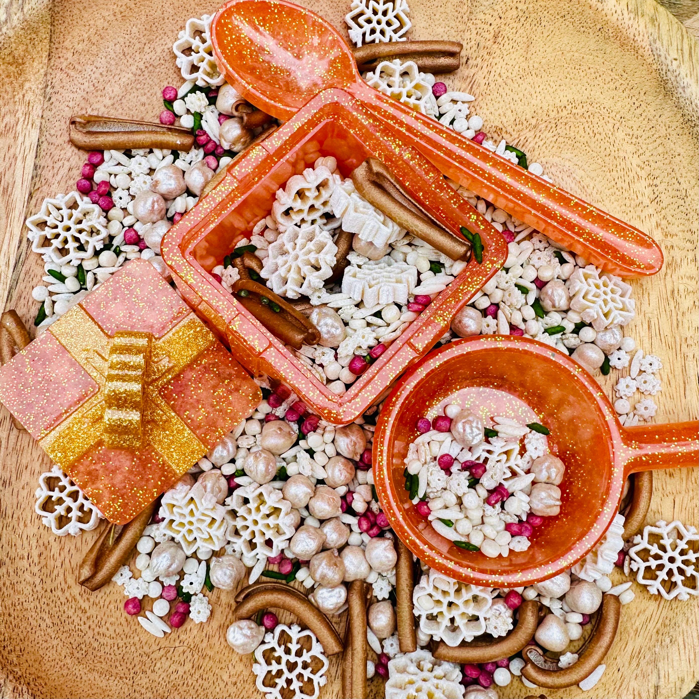 This glittering sensory play set features a festive resin gift box that really opens, along with a matching scoop and spoon for stirring, scooping, pouring, mixing, and hiding little treasures.